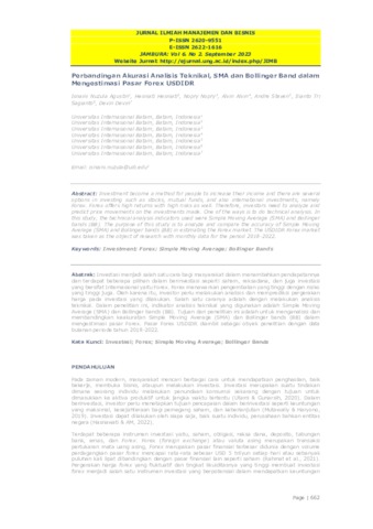 Hesniati, Hesniati Perbandingan Akurasi Analisis Teknikal, SMA dan Bollinger Band dalam Mengestimasi Pasar Forex USDIDR. Jurnal Ilmiah Manajemen dan Bisnis.