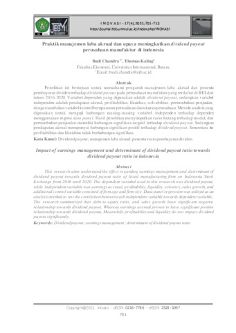 Chandra, Budi Praktik Manajemen Laba Akrual dan Upaya Meningkatkan Dividend Payout Perusahaan Manufaktur di Indonesia. INOVASI: Jurnal Ekonomi, Keuangan dan Manajemen.