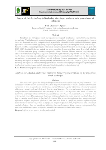 Chandra, Budi Pengaruh Intellectual Capital Terhadap Kinerja Perusahaan pada Perusahaan di Indonesia. AKUNTABEL: Jurnal Akuntansi dan Keuangan.