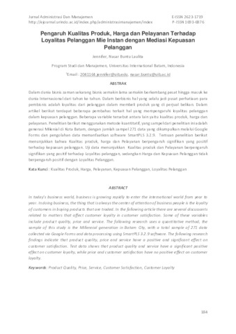 Laulita, Nasar Buntu Pengaruh Kualitas Produk, Harga dan Pelayanan Terhadap Loyalitas Pelanggan Mie Instan dengan Mediasi Kepuasan Pelanggan. Jurnal Administrasi dan Manajemen.