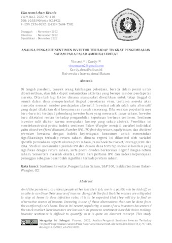 Candy, Candy Analisa Pengaruh Sentimen Investor terhadap Tingkat Pengembalian Saham pada Pasar Amerika Serikat. Jurnal Ekonomi dan Bisnis.