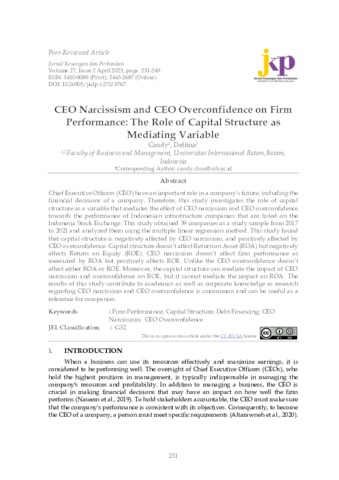 Candy, Candy CEO Narcissism and CEO Overconfidence on Firm Performance: The Role of Capital Structure as Mediating Variable. Jurnal Keuangan dan Perbankan.
