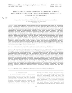 Untuk meningkatkan proses pendidikan dan pengajaran oleh dosen di perguruan tinggi, pembelajaran dilakukan dengan menggunakan teknologi Blended Learning. Blended learning merupakan suatu kolaborasi dan atau kombinasi diantara pembelajaran yang mempunyai sifat tradisional (pembelajaran yang dengan melakukan tatap muka langsung) dan pembelajaran dengan memanfaatkan teknologi atau yang disebut sebagai e-learning. Penerapan teknologi Blended Learning di perguruan tinggi di provinsi Kepulauan Riau telah dilakukan di beberapa perguruan tinggi di kota Batam. Penelitian sebelumnya menyatakan bahwa terdapat permasalahan dalam penerapan teknologi Blended Learning ini. Penelitian ini meneliti bagaimana Penerimaan Teknologi Blended Learning oleh Mahasiswa di kota Batam dengan metode Unified Theory of Acceptance and use of Technology (UTAUT). Dalam pelaksanaan kegiatan penelitian ini digunakan pendekatan kuantitatif dengan desain penelitian causalistic explanatory research. Hasil penelitian ini mengungkapkan bahwa ekspektasi usaha, ekspektasi kinerja, pengaruh sosial, dan kondisi fasilitas secara bersama-sama berpengaruh terhadap variabel independen Penerimaan Teknologi Blended Learning. Hal ini memperlihatkan bahwa keseluruhan Penerimaan Teknologi Blended Learning di kalangan mahasiswa sudah dapat diterima dengan baik.
