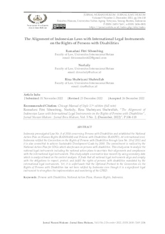 Rina Shahriyani, Shahrullah The Alignment of Indonesian Laws with International Legal Instruments on the Rights of Persons with Disabilities. Jurnal Nurani Hukum: Jurnal Ilmu Hukum.