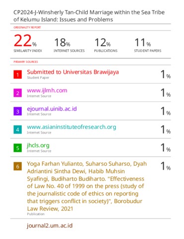 Tan, Winsherly Turnitin - Child Marriage within the Sea Tribe of Kelumu Island: Issues and Problems. Jurnal Media Hukum.