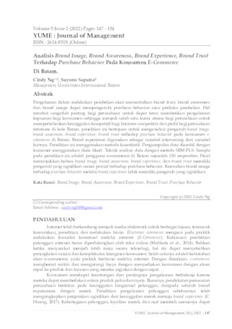 Ng, Cindy and Saputra, Suyono Analisis Brand Image, Brand Awareness, Brand Experience, Brand Trust Terhadap Purchase Behavior Pada Konsumen E-Commerce. YUME: Journal of Management.
