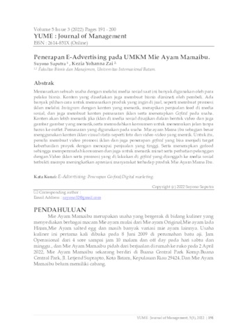 Saputra, Suyono and Zai, Kezia Yohanna Penerapan E-Advertising pada UMKM Mie Ayam Mamaibu. YUME: Journal of Management.