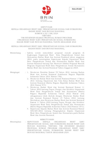 Salinan SK Kepala OR IPSH BRIN Nomor 4 Tahun 2024 tentang Tim Reviewer Seleksi Proposal Rumah Program Organisasi Riset Ilmu Pengetahuan Sosial dan Humaniora Badan Riset dan Inovasi Nasional Tahun Anggaran.pdf