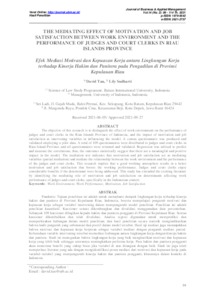 Tan, David and Sudhartio, Lily (2021) The Mediating Effect of Motivation and Job Satisfaction Between Work Environment and the Performance of Judges and Court Clerks in Riau Islands Province. Journal of Business & Applied Management (JoB&AM), 14 (2). pp. 99-114. ISSN 2621-2757